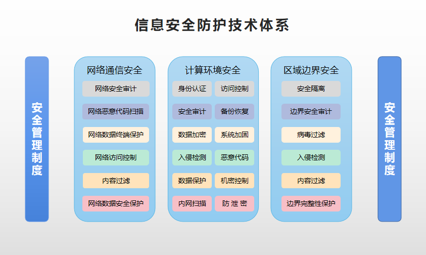 信息系統(tǒng)安全建設(shè)內(nèi)容: 信息系統(tǒng)的安全建設(shè)包括三方面:一是技術(shù)安全體系建設(shè);二是管理安全體系建設(shè);三是運行保障安全體系建設(shè)。其中,技術(shù)安全體系設(shè)計和建設(shè)是關(guān)鍵和重點。信息安全防護技術(shù)整體解決方案: