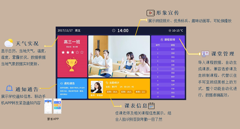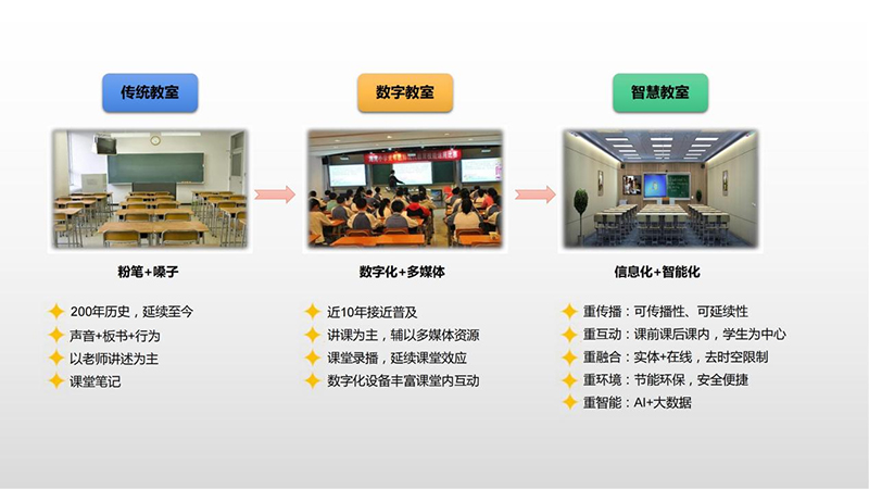 以云計算、大數(shù)據(jù)挖掘、物聯(lián)網(wǎng)、移動互聯(lián)等為標志的信息技術(shù)快速發(fā)展及在教育教學(xué)領(lǐng)域的應(yīng)用,使得我們傳統(tǒng)教室也漸漸從普通教室轉(zhuǎn)變?yōu)橹腔坌徒淌,從單一技術(shù)的教室應(yīng)用轉(zhuǎn)變?yōu)榉杭夹g(shù)的教學(xué)環(huán)境。