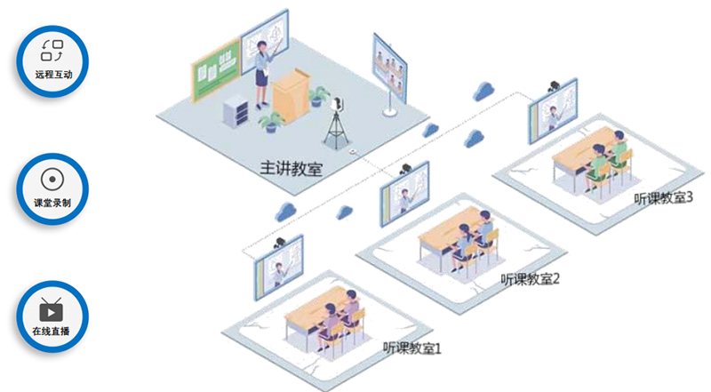 各課室建設(shè)錄播主機,實現(xiàn)課堂師生畫面跟蹤,音視頻錄制、在線直播、點播。系統(tǒng)實現(xiàn)在授課過程中,本地教室與遠程聽課教室之間的同步授課,以及實時音視頻互動交流;诱n程能夠同步錄制,真實展現(xiàn)互動教學(xué)場景。積極推動“一校帶多點”、“一校帶多!钡慕虒W(xué)和教研組織模式,逐步使依托信息技術(shù)的“優(yōu)質(zhì)學(xué)校帶薄弱學(xué)校、優(yōu)秀教師帶普通教室”模式制度化。