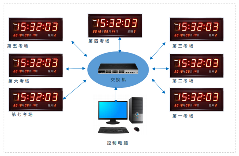 在學(xué)?紙鲈O(shè)計LED電子鐘,讓考生能時刻了解考試時間的進度,把握好自己答題的節(jié)奏,考出自己應(yīng)有的水平,同時學(xué)校考場電子鐘能通過軟件統(tǒng)一對所有考場的電子鐘校時,保證所有考生都在同一時間開始和結(jié)束考試,體現(xiàn)學(xué)校教學(xué)的嚴謹和保證考試的公平公正。
